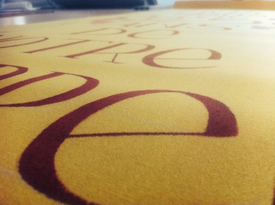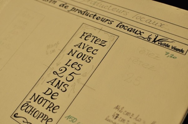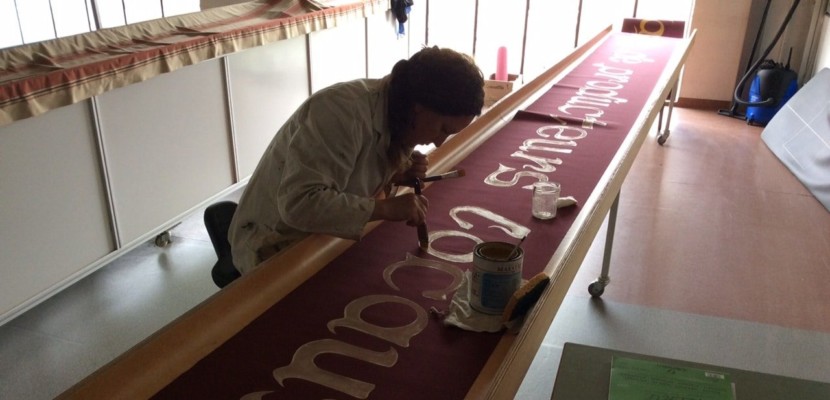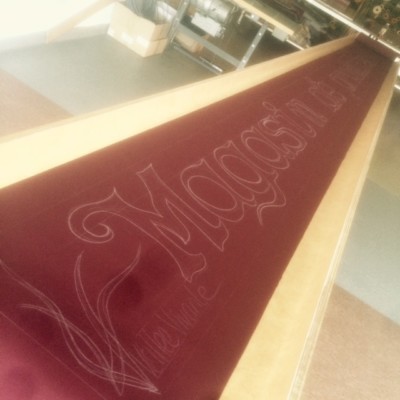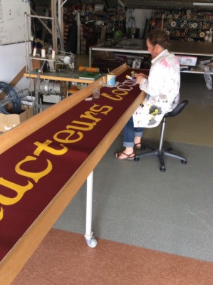 Réalisation d’une enseigne de 7 mètres de long. Peinture à la main sur toile professionnelle.