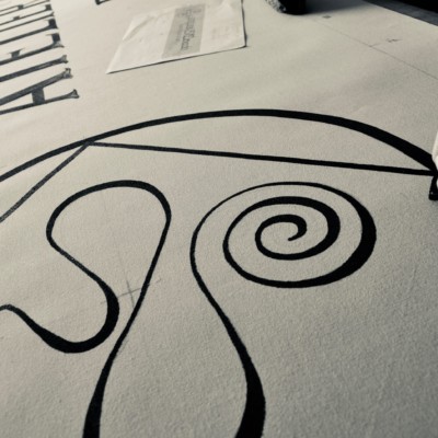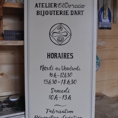 Réalisation d’une enseigne de boutique : peinture à la main sur toile professionnelle fixée sur cadre. + panneau horaires et étiquettes.
