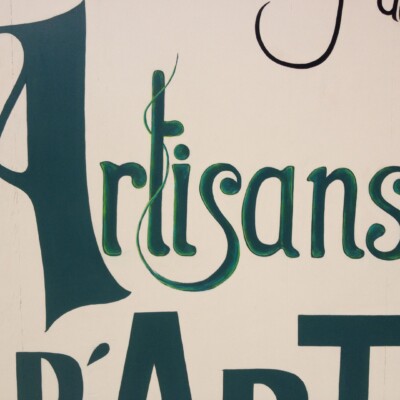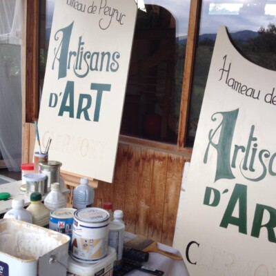 Lettres peintes à la main sur panneaux d’entrée de village.