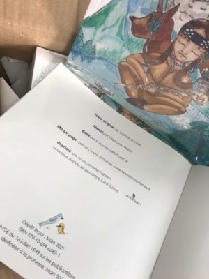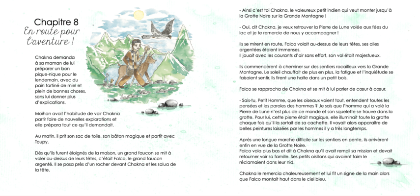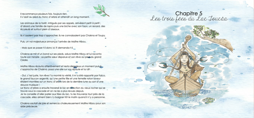 Je vous partage ici aussi ma collaboration avec mon amie Stéphanie Walter, illustratrice, qui a fait les graphismes du livre pour enfant « Chakna » de Martine Bouvier. Mon travail, ici, était la mise en page, mettre en lien, de façon fluide, le texte et les dessins.